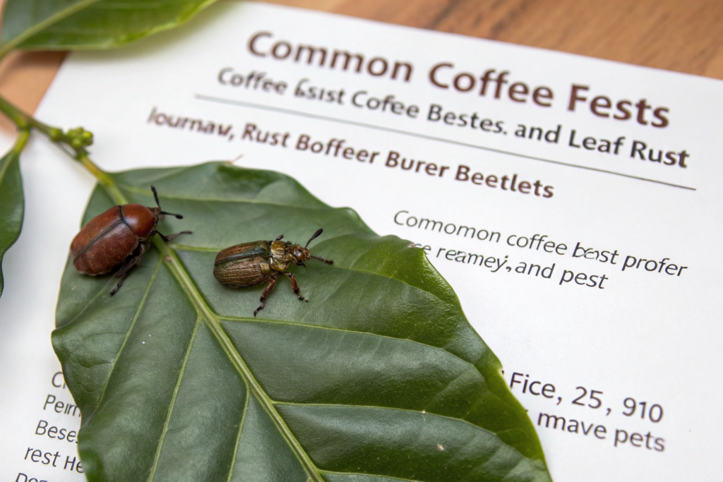 Coffee borer beetle is the most serious pest—tiny insects that bore into cherries, destroying beans from inside. Leaf rust (fungus) threatens plantations during humid periods. Other pests include leaf miners, scale insects, and nematodes. Without management, these can devastate crops.