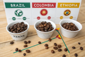 You're comparing coffee offers from Brazil, Ethiopia, Colombia, and Kenya. Each uses different grading terms: Brazil talks about "Strictly Soft,"…