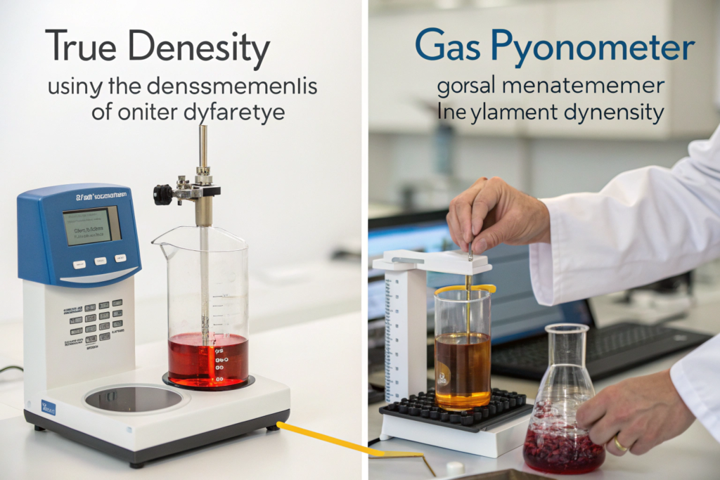 True density requires gas pycnometry. Equipment replaces air with helium or nitrogen, measures gas displacement, calculates volume of solid material only. No gaps counted.