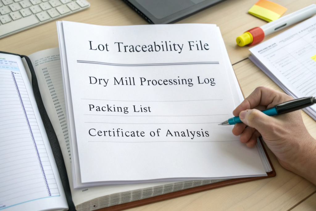 Traceability documentation prevents grade mixing by establishing a verifiable chain of custody from the specific farm block or processing batch to the final export bag, with each document (internal mill logs, warehouse receipts, and export certificates) referencing the same unique lot number, making it logistically difficult and easily detectable for a supplier to blend in beans from an untracked source.
