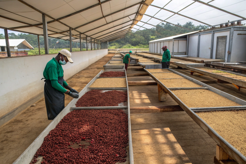 At our farms, we use consistent processing methods. For our washed Arabica, we depulp, ferment for a set time, wash, then dry on raised beds. For our naturals, we dry the whole cherry for a set number of days, turning regularly to prevent mold.