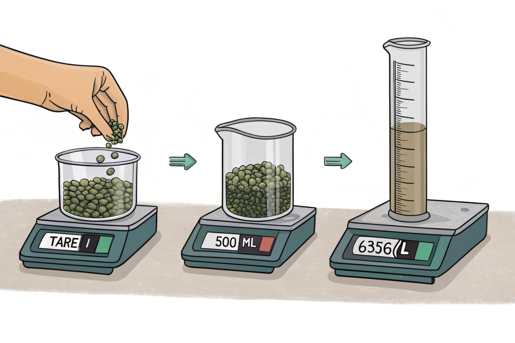 - Fill the Cylinder: Carefully pour your green coffee sample into the cylinder until the beans are level with the 500ml mark. Do not tap or shake the cylinder to settle the beans, as this will alter the density reading. Simply pour them in gently and level the top with a flat edge, like a ruler.