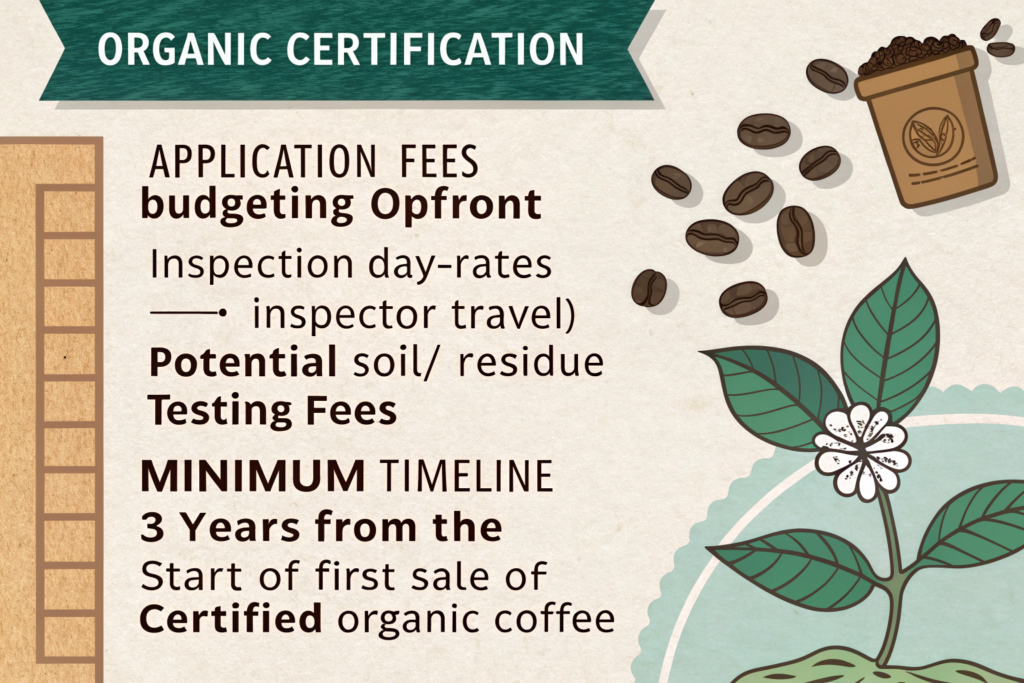 The total cost of organic certification includes application fees, annual renewal fees, inspection day-rates (plus inspector travel), and potential soil/residue testing fees. The minimum timeline is 3 years from the start of conversion to your first sale of certified organic coffee. Budgeting for this upfront prevents surprises. Remember, the cost per kilogram decreases as your certified volume increases.