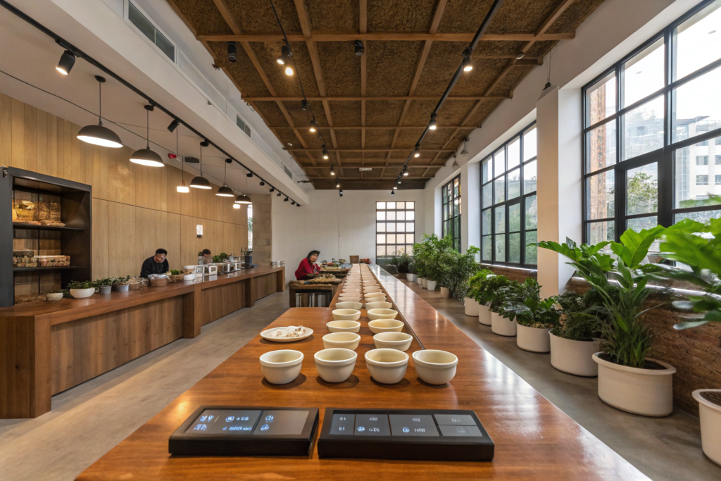 Setting up a professional coffee cupping space for clients means prioritizing natural light and neutral decor (to avoid flavor and visual distractions), arranging the table and tools for maximum efficiency, controlling the room temperature and humidity (critical for accurate cupping), and eliminating any distracting smells or noises that could alter the client’s palate or focus. At Shanghai Fumao, our Yunnan tasting room is designed with all these elements in mind, and it’s been the setting for hundreds of successful cupping sessions and closed deals with international buyers.
