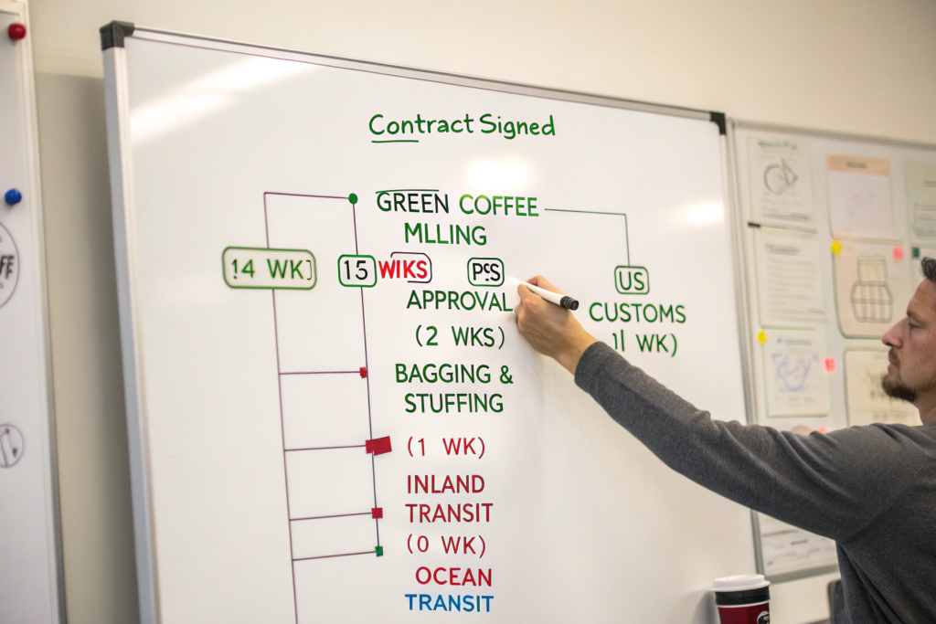 If the best-case timeline is 12 weeks, plan for 16-17 weeks. It is always better to have coffee arrive early and sit in your warehouse (properly stored in GrainPro) than to have it arrive late and miss your launch date. Early is on time. On time is late.