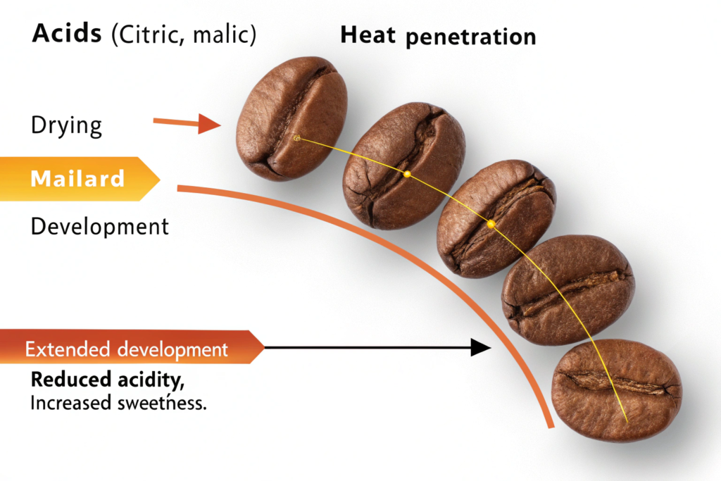 Acidity in coffee is a complex mix of organic acids (citric, malic, chlorogenic, etc.) present in the green bean. During roasting, these acids are not static; they are created, transformed, and destroyed at different temperature thresholds. The roaster's job is to steer these chemical reactions.
