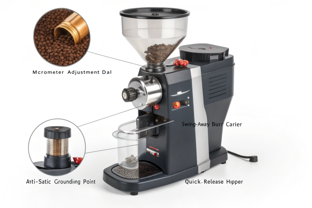 - Minimal Retention Design: "Retention" is the amount of old ground coffee left inside the machine after grinding. High-retention grinders contaminate fresh batches with stale grounds. Modern designs aim for sub-1g retention. This is critical for product consistency, especially when switching between different coffees.