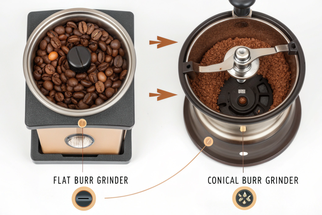 - How they work: Two large, horizontal disc-shaped burrs (one stationary, one rotating) crush and shear beans between them. The grind size is adjusted by changing the distance between the burrs.