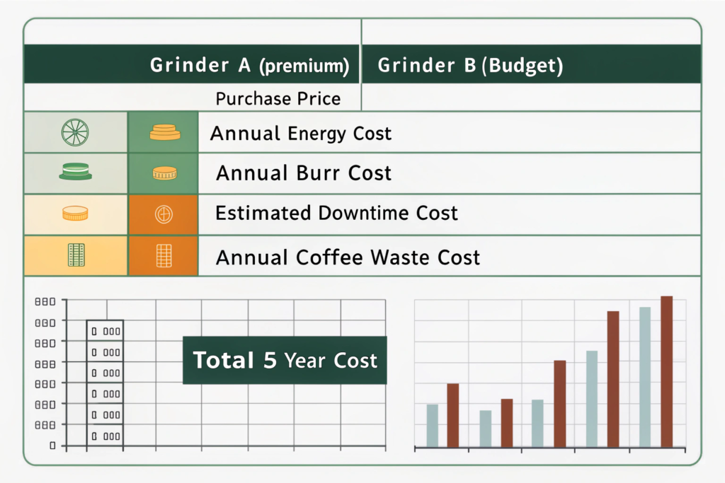 A $8,000 grinder that runs trouble-free for 10 years with minimal waste is far cheaper than a $4,000 grinder that needs $2,000 in repairs annually, wastes 2% of your coffee, and requires 30 extra minutes of labor daily to clean.