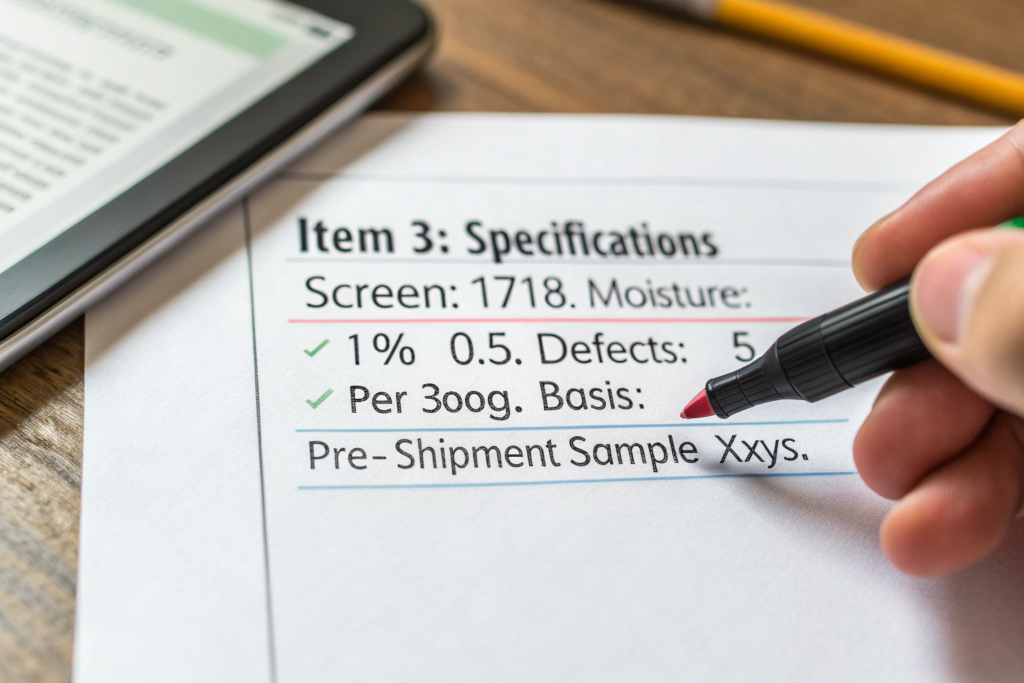 - Quality Benchmarking: The contract should be based on a pre-shipment sample that you have approved. State: "Quality of the shipment must match the approved pre-shipment sample within a 2-point cupping score tolerance."