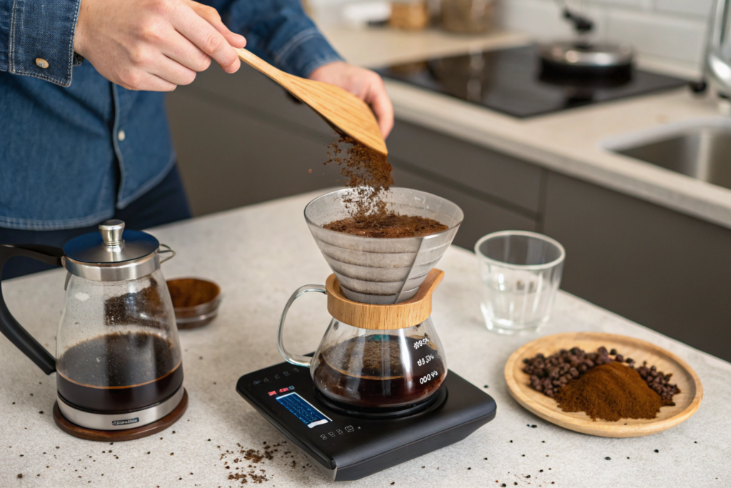 Pour-over (V60, Chemex, Kalita): The pour itself creates agitation. A high, fast pour creates more agitation. A low, slow pour (gooseneck kettle) creates less. Most experts recommend a medium pour height. Then add one gentle stir or swirl after pouring.