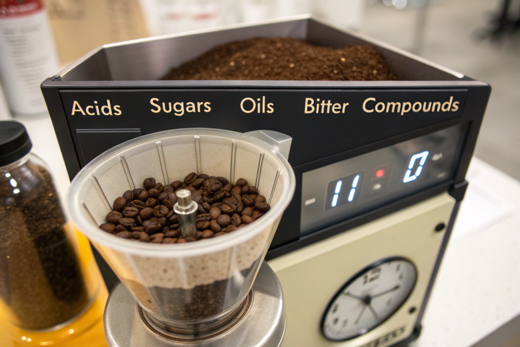 To understand brewing time, you have to understand extraction. Extraction is what happens when water meets coffee. It pulls out the compounds that give coffee its flavor. And it happens in stages.