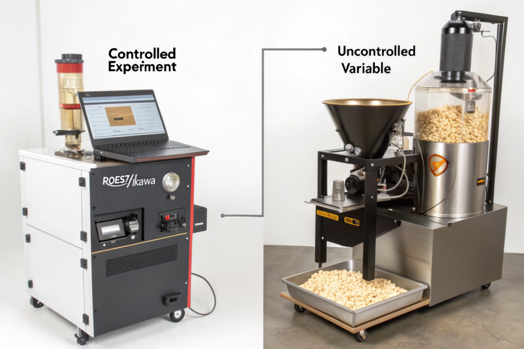 Home roasters introduce uncontrolled variables that invalidate the sample as a proxy for production potential. A sample that tastes great from a hot-air popper may roast terribly in your 60kg Probat. The sample roast must be a controlled experiment, not a craft project.