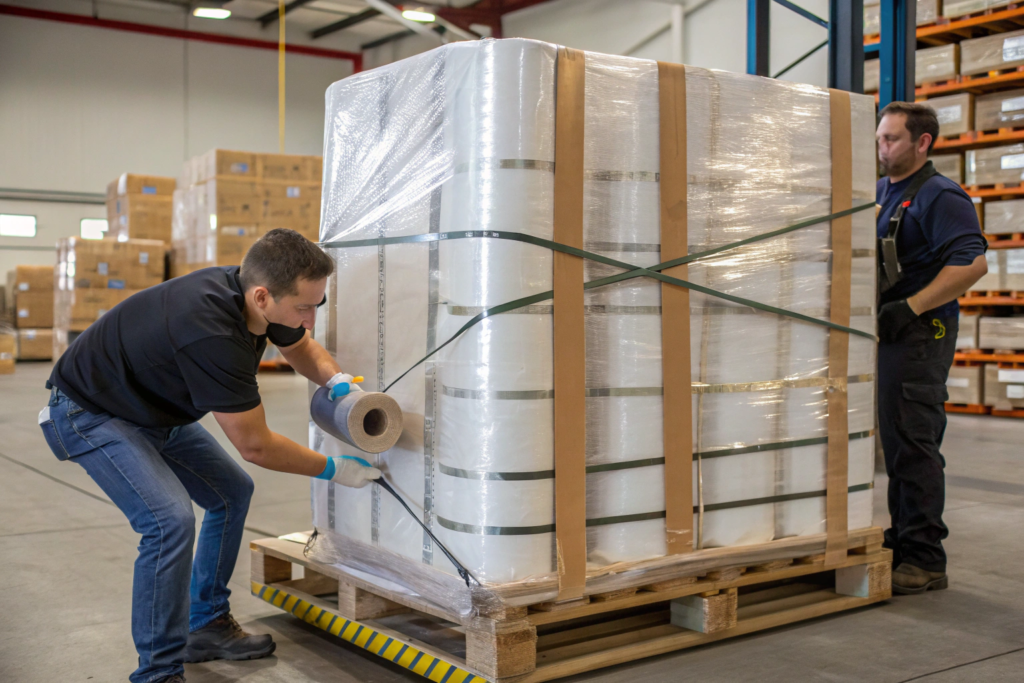 For added security, especially for heavy loads or long journeys, plastic or metal strapping should be applied over the shrink wrap. Typically, two straps are applied in each direction (four straps total), running under the top deck of the pallet. This strapping provides crucial vertical and horizontal reinforcement and is the ultimate defense against the load shifting or deforming under pressure. At Shanghai Fumao, every export pallet gets this full wrap-and-strap treatment.