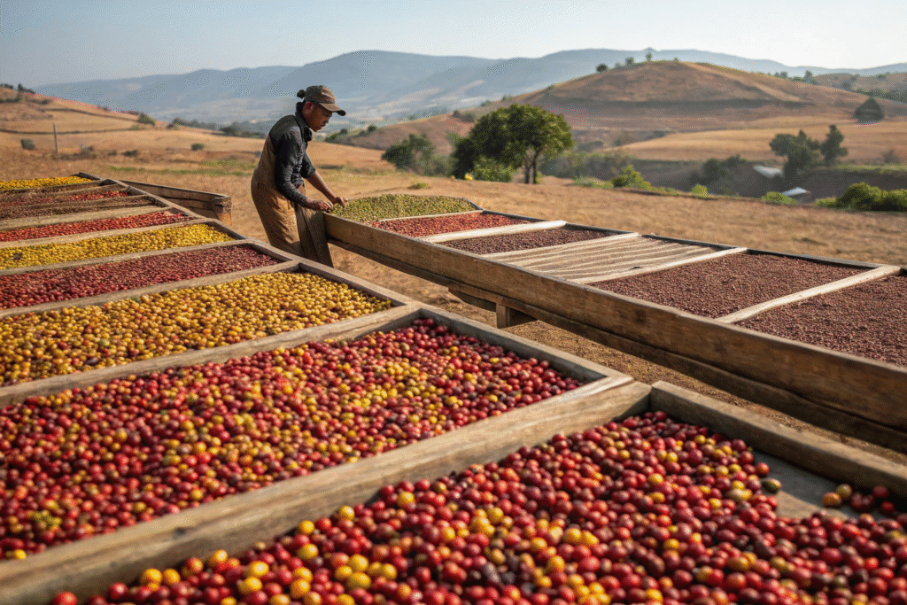 Think of it like making a sundried tomato. As the cherry dries, the sugars in the fruit pulp concentrate and ferment. The bean, sitting inside this sugary environment, soaks up these compounds. This is why Natural coffees have such intense berry, wine, and tropical fruit notes, along with a heavy, syrupy body. The skill lies in constant turning to prevent mold—a risk that makes this the most demanding method. When done well, as with some of our experimental Yunnan lots, the flavor development is incredible.