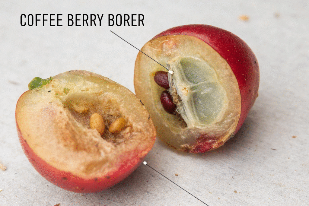 The Coffee Berry Borer is a small (1.5mm) dark beetle that bores into coffee berries to lay its eggs. The larvae then feed on the coffee bean itself, rendering it worthless for commercial sale.