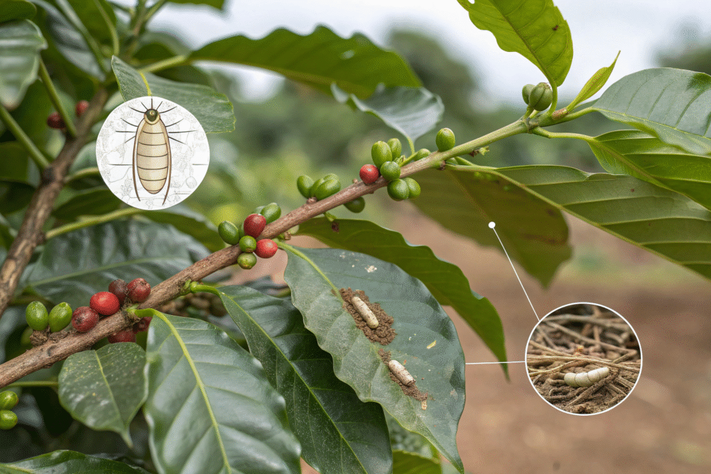 The Coffee White Stem Borer, nematodes, and various mites can cause significant damage when environmental conditions favor their development.