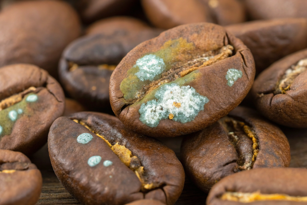 Moldy beans are a severe defect caused by storing coffee at high humidity or with excessive moisture. They may show visible white, green, or blue fungal growth or more subtle yellow/brown spotting. Beyond imparting a distinct musty, earthy flavor, certain molds can produce mycotoxins, such as Ochratoxin A (OTA). Long-term consumption of these toxins is a health concern, making mold prevention a key focus of food safety programs in producing countries.