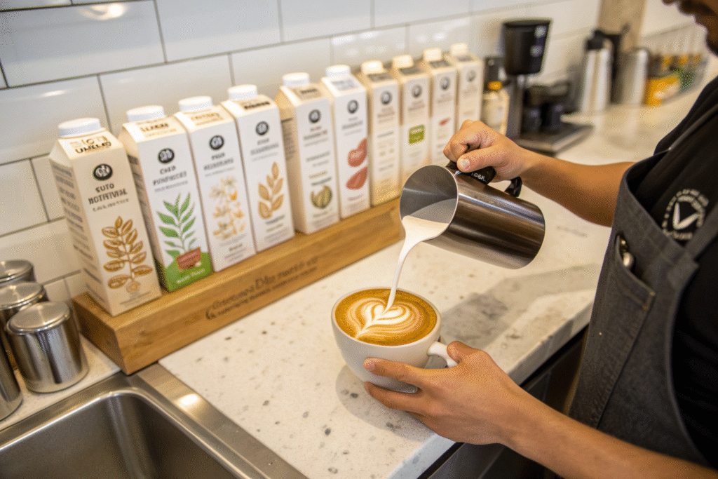Plant-based milks are now a default option, not an alternative. Oat milk leads due to its creamy texture and superior performance in steaming, but almond, soy, and newer entrants like potato and pea milk are also holding their space.