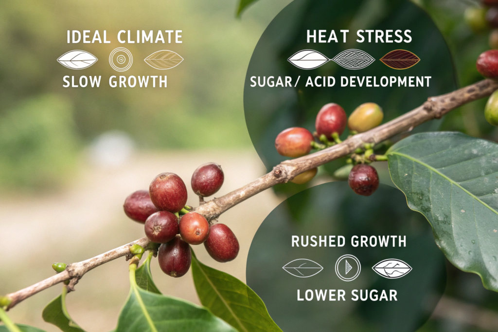 Coffee, especially Arabica, is a Goldilocks crop. It thrives in a narrow temperature band (18-22°C / 64-72°F). When temperatures consistently exceed this range, the plant's metabolism goes into overdrive.