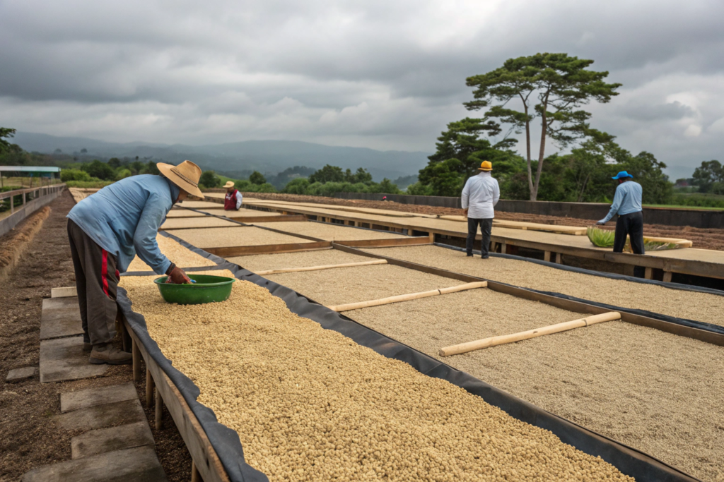 Beans are spread on beds to dry, with the sticky mucilage still attached. They're turned frequently to prevent sticking and mold. Over 10-20 days, they dry and darken. The result is a coffee with body and sweetness from the mucilage, but cleaner than a natural. It's a beautiful middle ground.
