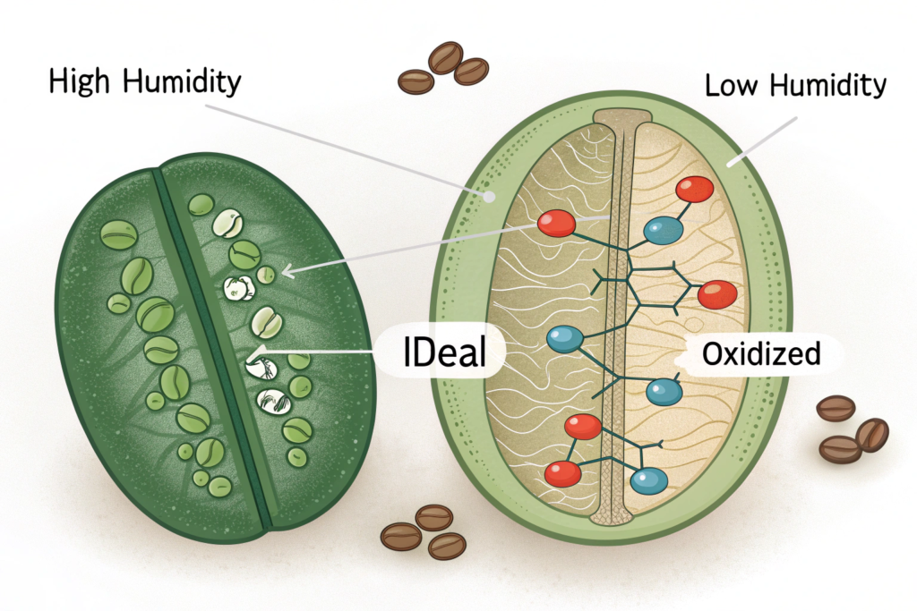 At high humidity levels (above 65% RH), beans absorb excess moisture. This creates the perfect breeding ground for mold and mycotoxins (like Ochratoxin A), which are serious food safety hazards. It also accelerates staling and can lead to "baggy" or musty off-flavors. At low humidity levels (below 45% RH), beans lose moisture too quickly. This causes them to become brittle, lose mass (affecting your yield), and leads to accelerated oxidation and flavor loss—the coffee tastes stale and papery long before its time. Stable, moderate humidity keeps the bean in a state of equilibrium, slowing down all these degrading reactions.