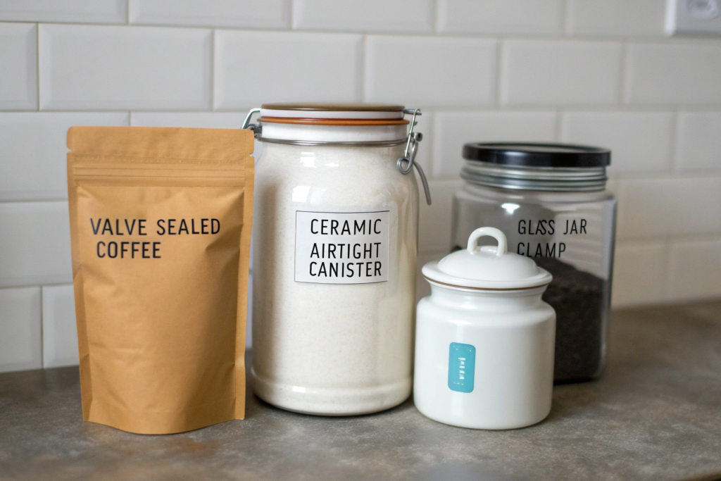 For opened coffee, I recommend an airtight ceramic or stainless steel canister with a tight seal. Glass can work if it’s kept in a dark place. But clear glass lets light in, so it’s not ideal unless you keep it inside a cupboard.