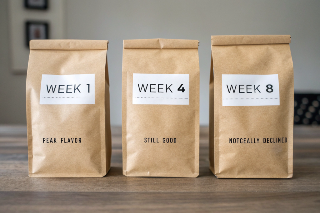 For peak flavor, aim to consume within two to four weeks of the roast date. That’s when the coffee has degassed enough to brew well, but before oxidation has taken its toll.