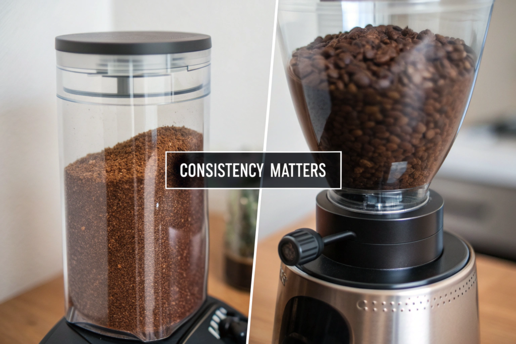 A blade grinder chops beans unevenly. You get dust and chunks mixed together.