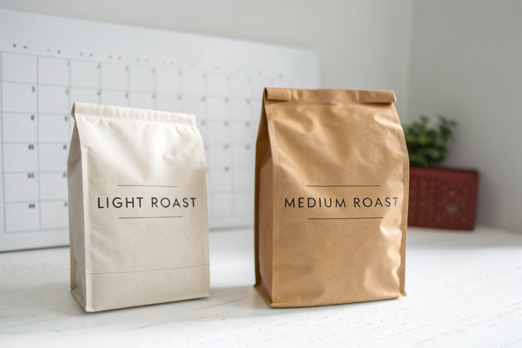 Medium roast, especially if it’s pushed closer to the dark end, starts to release oils. Those oils go rancid over time. That’s the stale, cardboard smell you get from old coffee. So if you’re buying in bulk and expect the product to sit on a shelf for a few months, light roast gives you a wider margin of safety.