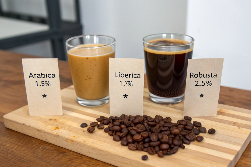 Robusta has the highest caffeine content of the three main species, typically ranging from 2.5% to 4.5% by weight. Liberica has a lower caffeine content than Robusta, generally falling between Arabica and Robusta, often around 1.7%.