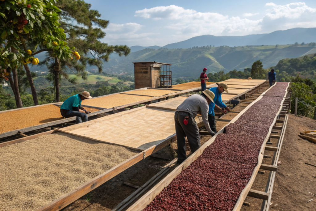 Natural processing involves drying whole cherries immediately after harvest. Cherries spread on patios or raised beds, turned regularly, and dried for 2-4 weeks until moisture reaches 11 percent. Then the dried fruit is hulled off, revealing beans that have absorbed fruit compounds during drying. The result: intense fruit, wine-like complexity, and heavy body.