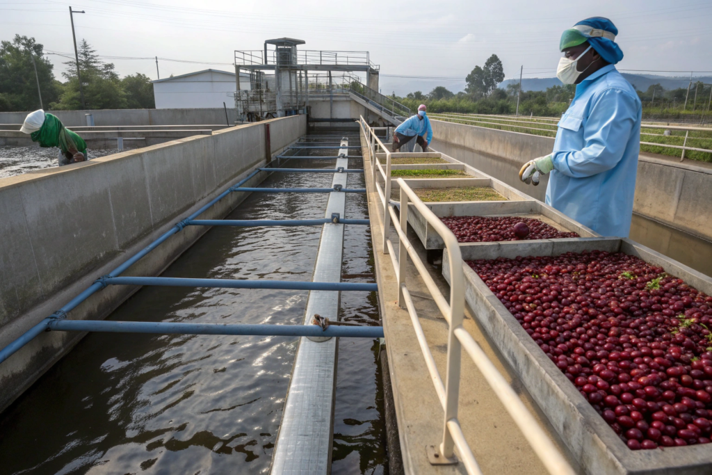 Traditional "wet processing" uses large amounts of water to ferment and wash the mucilage off the beans. If this wastewater, full of organic sugars and pulp, is released untreated into rivers, it decomposes and sucks oxygen out of the water, killing aquatic life. It's a severe local pollutant.