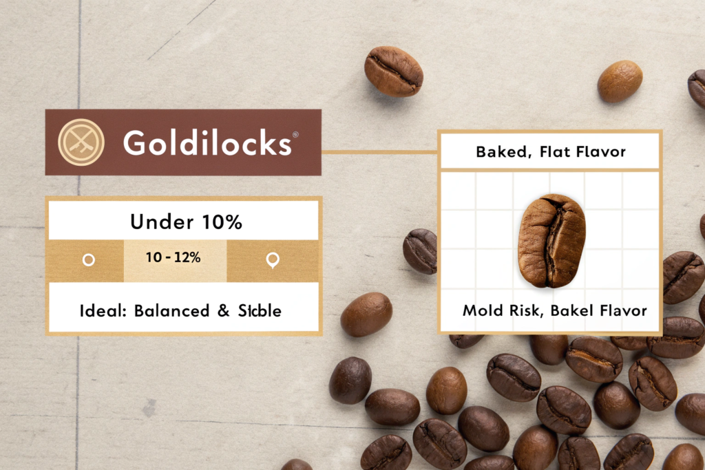 While 10-12% is the universal safe zone, the perfect target within that range can be fine-tuned. Denser beans (typically high-altitude, hard bean Arabica) can often tolerate and even benefit from being on the lower end of the range (~10.5-11%), as their dense structure retains water well and they require more energy to roast. Less dense beans might perform better at 11-11.5%.