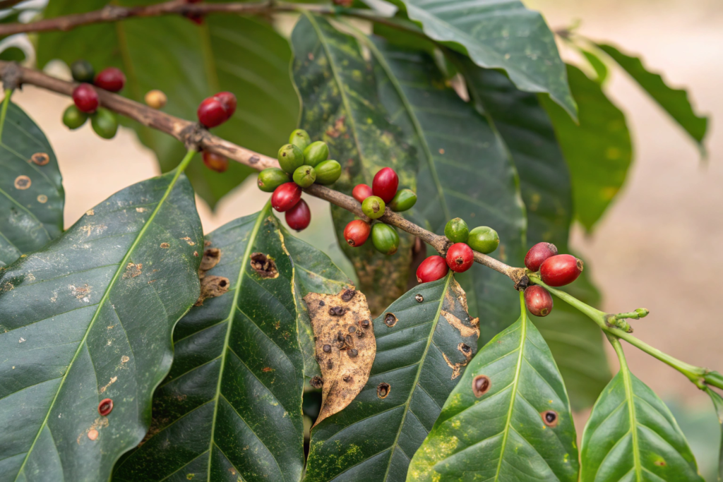 Coffee leaf rust, a fungal disease, thrives in warmer, wetter conditions. It defoliates plants, sometimes killing them entirely. Major outbreaks have devastated Central American production in recent years.
