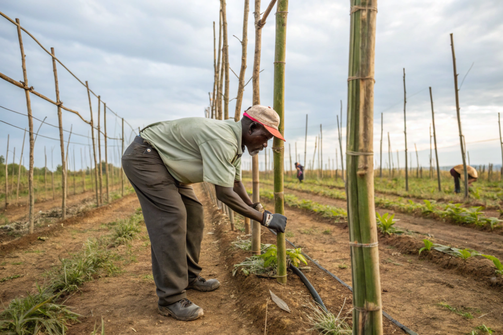 Common in Latin America and adapted by us in Yunnan, Agobiado involves bending and tying a primary vertical stem horizontally, then topping it. This breaks apical dominance and stimulates multiple vertical suckers to grow along the bent stem. The yield impact is cyclical: