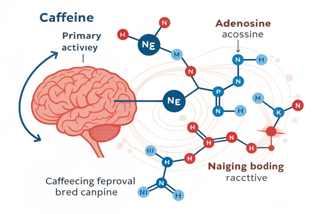 Caffeine’s primary mechanism is adenosine antagonism. Throughout the day, your brain produces adenosine, a neurotransmitter that binds to its receptors and slows down neural activity, making you feel tired. Caffeine has a similar molecular structure to adenosine. When you consume it, caffeine occupies those receptors instead—but it doesn’t activate them. It simply blocks the adenosine from getting through.