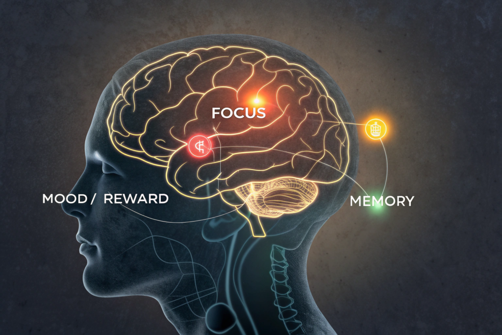 Blocking adenosine is just the first step in a chain reaction. With the "brakes" off, your brain's other neurotransmitter systems go into high gear. This secondary effect is what produces many of caffeine's most desirable cognitive benefits.