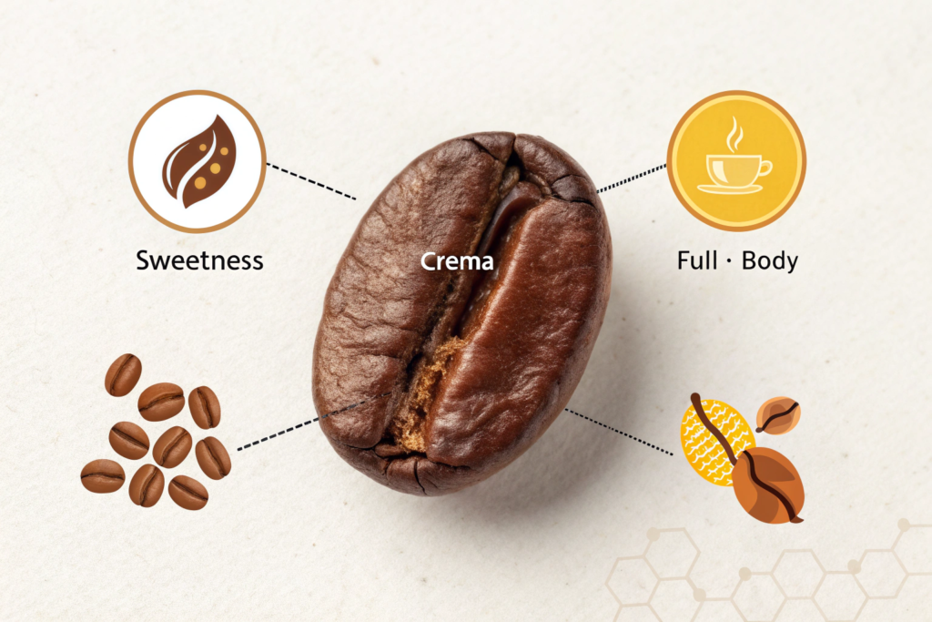 At a medium-dark roast (just past the end of "first crack" and into the beginning of "second crack"), the beans develop soluble compounds that are ideal for high-pressure extraction. The roast reduces the bean's acidity and increases its body and sweetness through caramelization. The cell structure becomes more brittle, allowing water to extract flavors efficiently and produce a stable, persistent crema. This roast profile also masks minor defects in the green beans and blends different origins together harmoniously, which is why it's the backbone of commercial espresso blends. For a business serving high volume with consistency, this is often the safest, most crowd-pleasing choice.